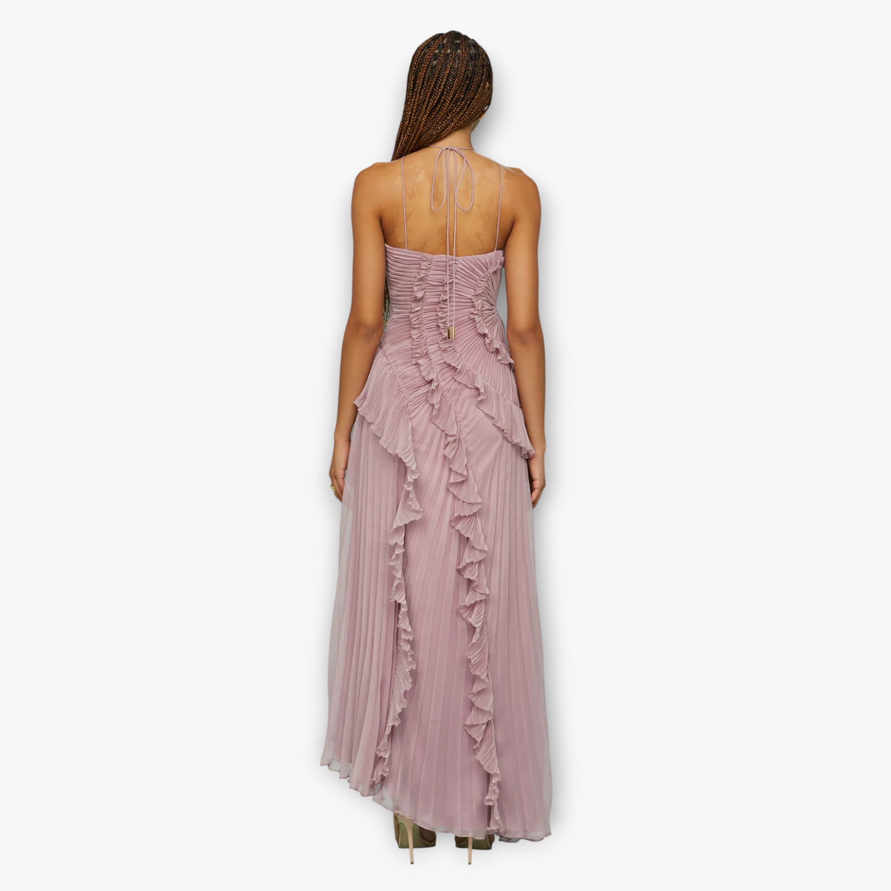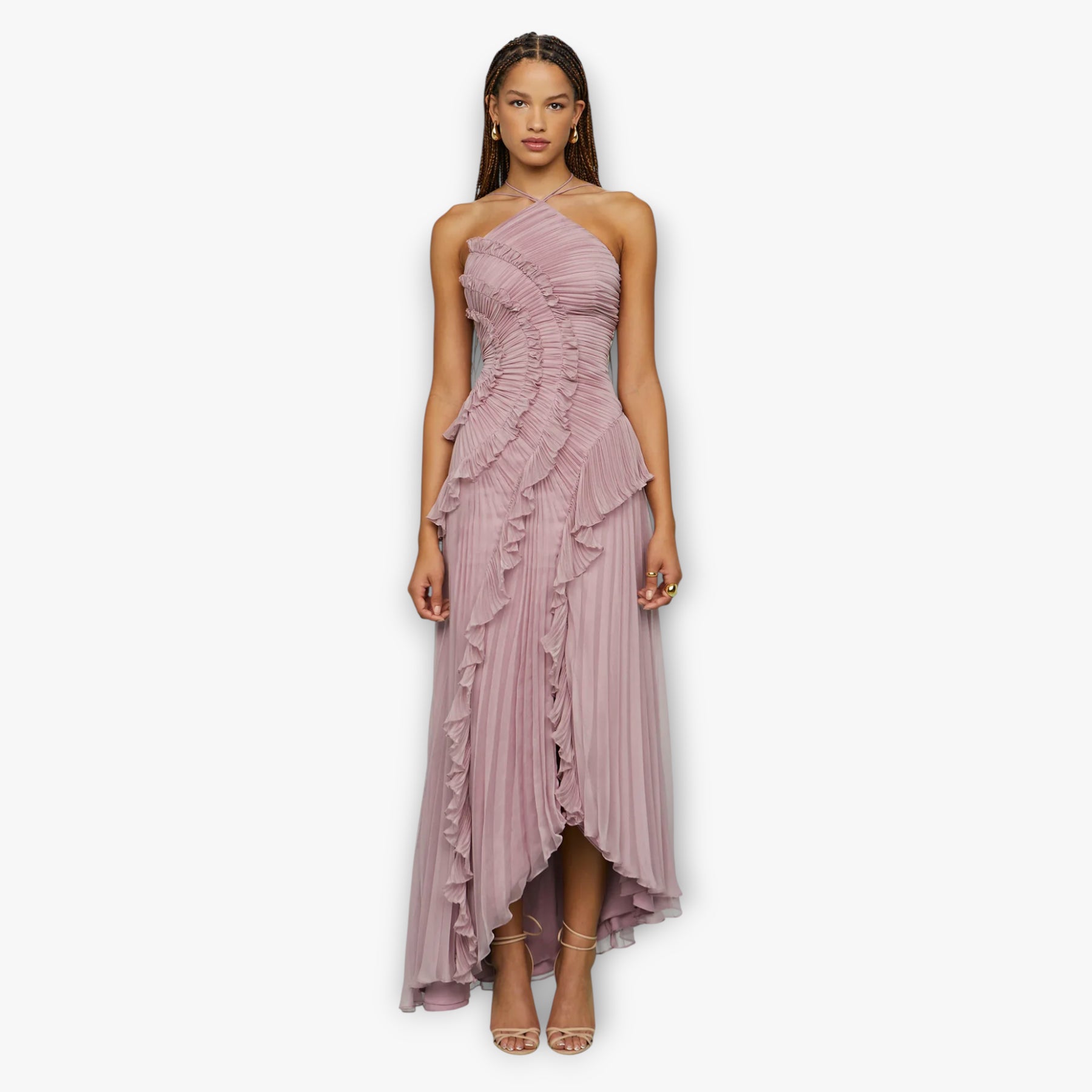 A flowing midi dress with sculpted draping and a flattering halter look. Light, breathable comfort makes it ideal from cocktail hour to late-night plans.